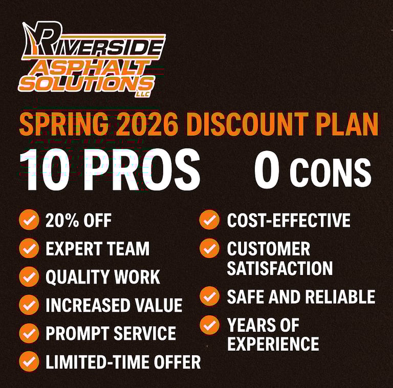 This Spring 2025, Riverside Asphalt Solutions is rolling out our best deal yet — 20% off all paving, patching, and resurfacing services! From driveways to parking lots, our expert team delivers high-quality, long-lasting results that boost curb appeal and safety without breaking your budget. Take advantage of our limited-time offer and experience why our customers trust Riverside for professional results, every time. No cons, just pros — and major savings!