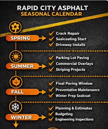 Riverside Asphalt Solutions schedules projects strategically around Rapid City’s weather patterns to ensure long-term performance.
